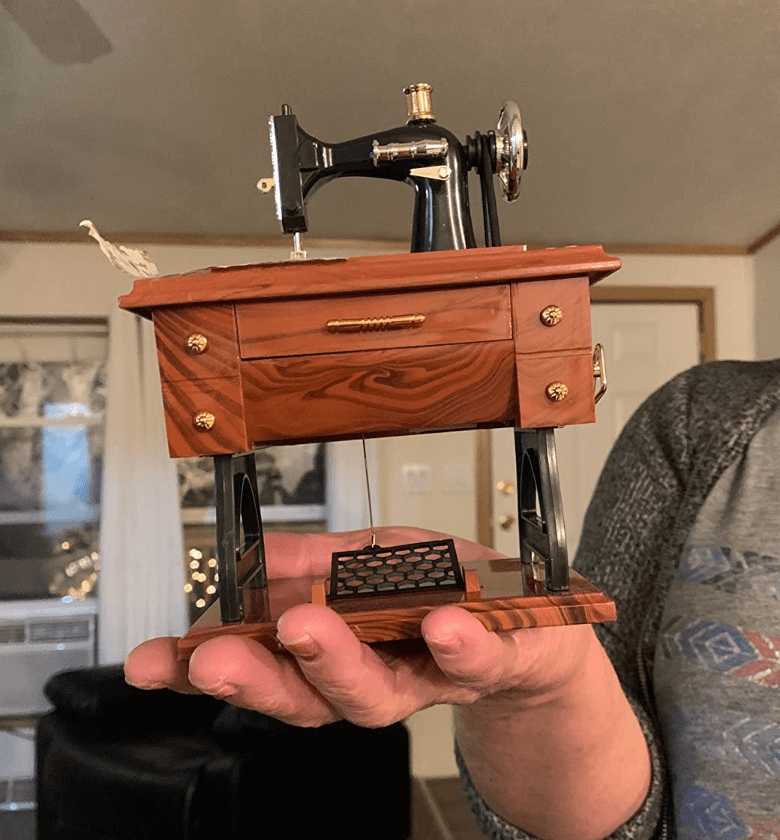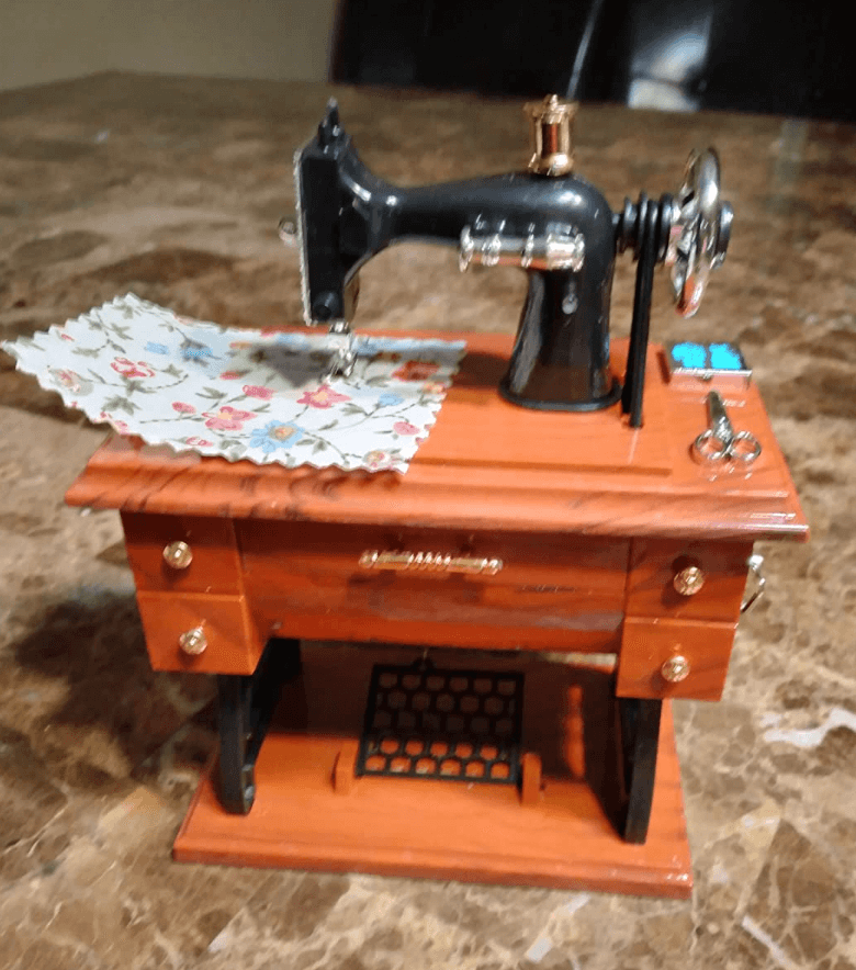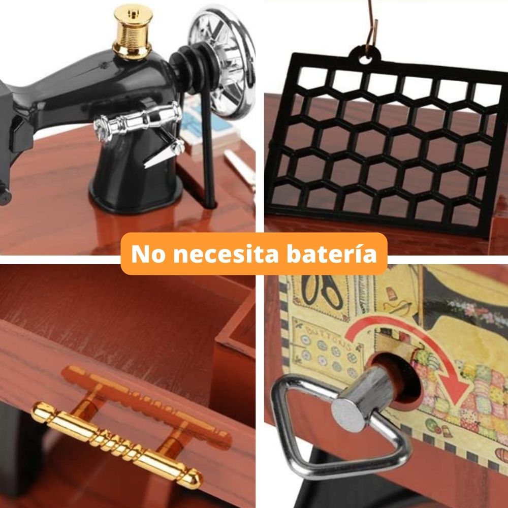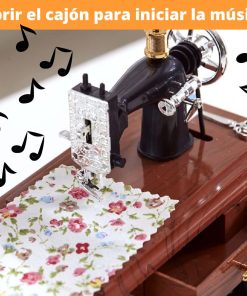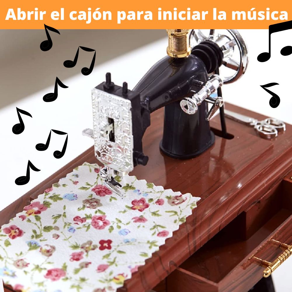 Me encanta. Mucho mejor de lo que esperaba. Sacas el cajón grande del medio y empieza a sonar una caja musical. Y MIENTRAS ESTÁ TOCANDO, partes de la máquina empiezan a moverse, como (1) la bobina de hilo en la parte superior de la máquina, (2) la rueda grande en el lado derecho de la máquina, y (3) el treddle debajo de la máquina. Simplemente «impresionante». La compré para hacer una lámpara con ella.