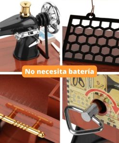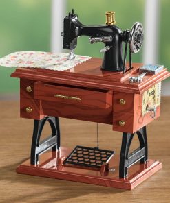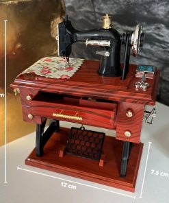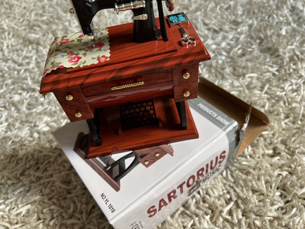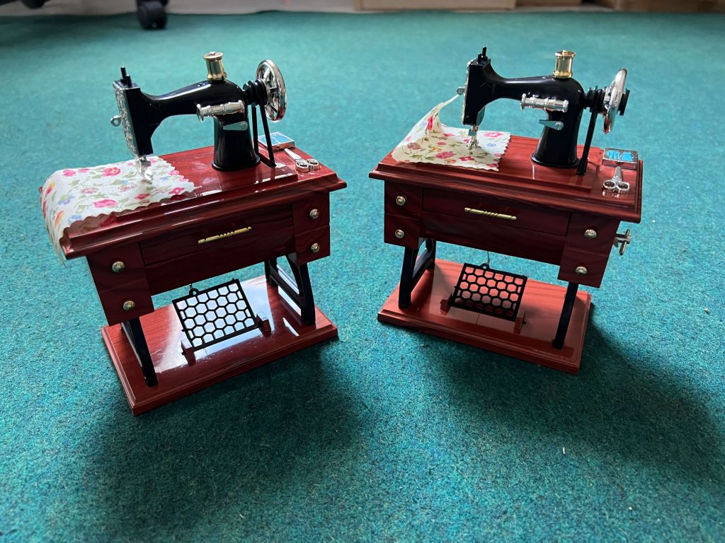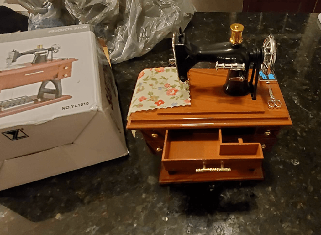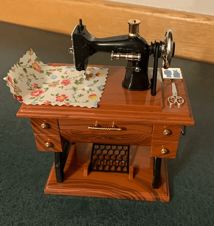 Me encanta. Mucho mejor de lo que esperaba. Sacas el cajón grande del medio y empieza a sonar una caja musical. Y MIENTRAS ESTÁ TOCANDO, partes de la máquina empiezan a moverse, como (1) la bobina de hilo en la parte superior de la máquina, (2) la rueda grande en el lado derecho de la máquina, y (3) el treddle debajo de la máquina. Simplemente «impresionante». La compré para hacer una lámpara con ella.